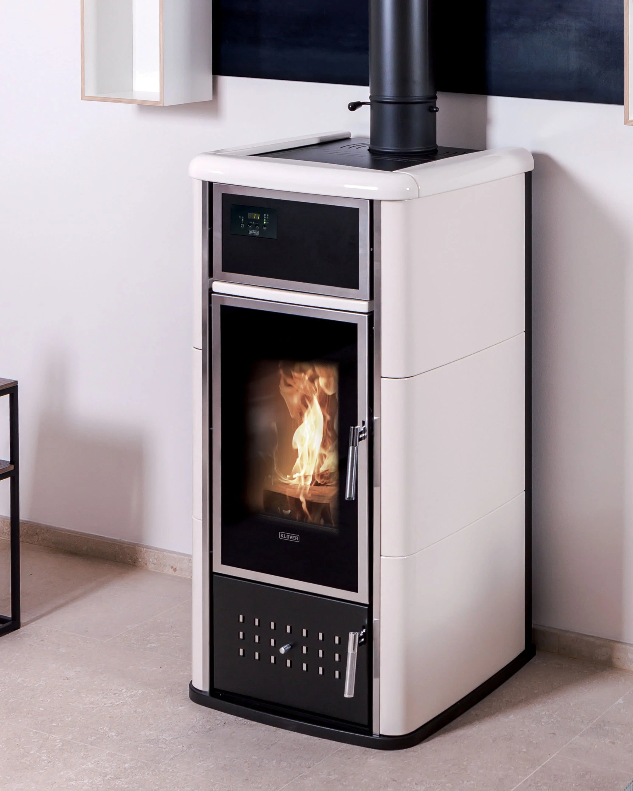 The KLOVER BELVEDERE 20 is an extraordinary heating stove with an elegant and sophisticated design and unique technical characteristics. The door of the combustion chamber is double glazed ceramic glass with an internal air chamber, so avoiding the possibility of a burn caused by contact with the glass. It has all the hydraulic components necessary for installation in any type of system as it includes the SICURO top safety system and a special fire grill. Hand decorated majolica enriches and compliments the design